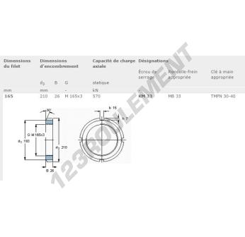 Cet écrou KM33-SKF possède un diamètre intérieur de 165mm, un diamètre extérieur de 210mm et une épaisseur de 26mm.