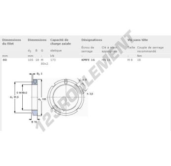 Cet écrou KMFE16-SKF possède un diamètre intérieur de 80mm, un diamètre extérieur de 105mm et une épaisseur de 18mm.