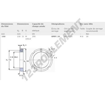 Cet écrou KMFE20-SKF possède un diamètre intérieur de 100mm, un diamètre extérieur de 130mm et une épaisseur de 21mm.