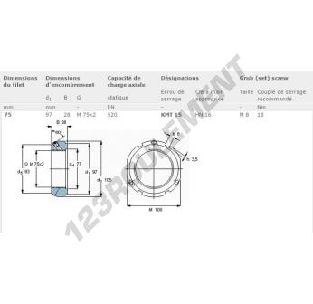 Cet écrou KMT15-SKF possède un diamètre intérieur de 75mm, un diamètre extérieur de 97mm et une épaisseur de 28mm.