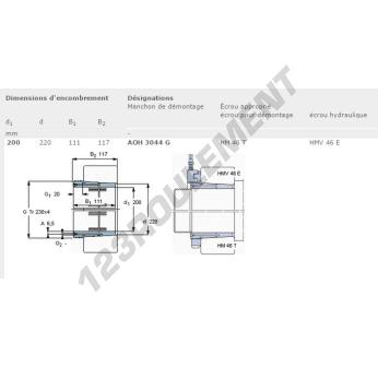 Le Manchon, connu sous la référence AOH3044G-SKF SKF, possède un diamètre intérieur de 200 mm, un diamètre extérieur de 220 mm et une épaisseur de 111 mm.