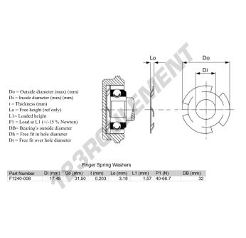 La Rondelle Ressort de référence F1240-009 possède un diamètre intérieur de 17.48 mm, un diamètre extérieur de 31.5 mm et une épaisseur de 0.203 mm.