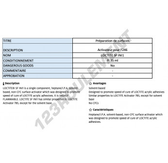 Le Loctite SF INI1 35ML est un activateur de précision de 35ML, idéal pour les petites applications nécessitant une performance rapide et un durcissement efficace des adhésifs Loctite.