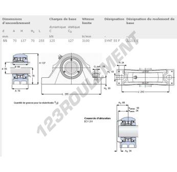 Le Palier - 2 Fixations connu sous la référence SYNT55F-SKF SKF possède un diamètre d'alésage de 0 mm et un entraxe de fixation de mm. Cette référence est fabriquée en fonte et le type de serrage se fait par Sans blocage.