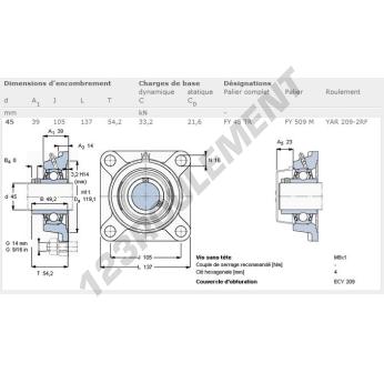 Le Palier - 4 Fixations connu sous la référence FY45-TR-SKF de la marque SKF possède un diamètre d'alésage de 45 mm et un entraxe de fixation de 105 mm. Cette référence est fabriquée en fonte et le type de serrage se fait par vis de blocage.