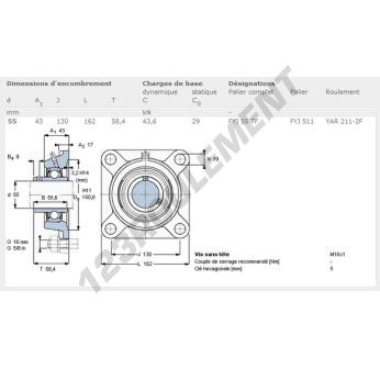 Le Palier - 4 Fixations connu sous la référence FYJ55-TF-SKF de la marque SKF possède un diamètre d'alésage de 55 mm et un entraxe de fixation de 130 mm. Cette référence est fabriquée en fonte et le type de serrage se fait par vis de blocage.
