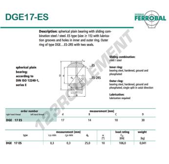 La Rotule Ge connue sous la référence DGE17-ES-DURBAL, de la marque DURBAL possède un diamètre intérieur de 17mm, un diamètre extérieur de 30mm et une épaisseur de 10mm.