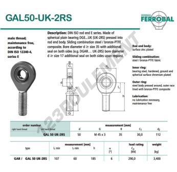 La Rotule Ge connue sous la référence GAL50-UK-2RS-DURBAL, de la marque DURBAL possède un diamètre intérieur de 50mm, un diamètre extérieur de 112mm et une épaisseur de 35mm.