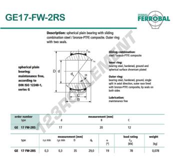 La Rotule Geew connue sous la référence GE17-FW-2RS-DURBAL, de la marque DURBAL possède un diamètre intérieur de 17mm, un diamètre extérieur de 35mm et une épaisseur de 12mm.