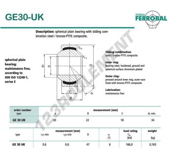 La Rotule Geew connue sous la référence GE30-UK-DURBAL, de la marque DURBAL possède un diamètre intérieur de 30mm, un diamètre extérieur de 47mm et une épaisseur de 18mm.