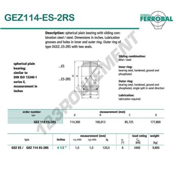 La Rotule Geew connue sous la référence GEZ114-ES-2RS-DURBAL, de la marque DURBAL possède un diamètre intérieur de 114.3mm, un diamètre extérieur de 177.8mm et une épaisseur de 85.725mm.