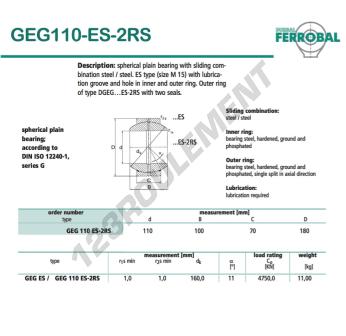 La Rotule Geg connue sous la référence GEG110-ES-2RS-DURBAL DURBAL possède un diamètre intérieur de 110 mm, un diamètre extérieur de 180 mm et une épaisseur de 70 mm.