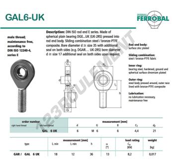 La Rotule Sa connue sous la référence DGAL6-UK-DURBAL, de la marque DURBAL possède un pas de vis de et un Filetage à gauche, un diamètre intérieur de 6mm, un diamètre extérieur de 21mm et une épaisseur de 6mm.