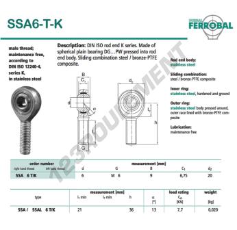 La Rotule Sa connue sous la référence SSA6-T-K-DURBAL, de la marque DURBAL possède un pas de vis de et un Filetage à droite, un diamètre intérieur de 6mm, un diamètre extérieur de 20mm et une épaisseur de 9mm.