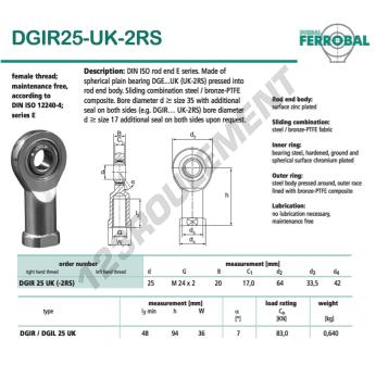 La Rotule Si connue sous la référence DGIR25-UK-2RS-DURBAL, de la marque DURBAL possède un diamètre intérieur de 25mm, un diamètre extérieur de 64mm et une épaisseur de 20mm.
