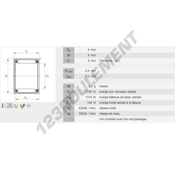 La Douille à Aiguilles, connue sous la référence BK0408-INA, de la marque INA, possède un diamètre intérieur de 4 mm, un diamètre extérieur de 8 mm et une épaisseur de 8 mm.