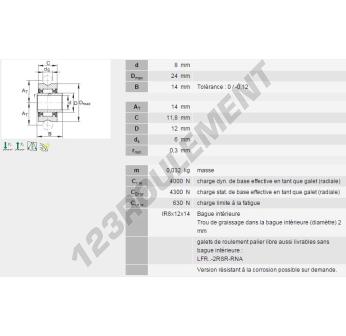 Le Galet à Billes, connu sous la référence LFR22-8-6-2RSR-NA-INA, de la marque INA, possède un diamètre intérieur de 8mm, un diamètre extérieur de 24mm et une épaisseur de 14mm.