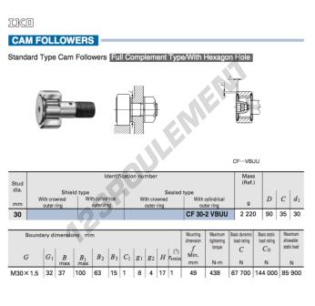 Le Galet De Came Avec Axe, connu sous la référence CFKR90-VUU-IKO, de la marque IKO, possède un diamètre intérieur de 30mm, un diamètre extérieur de 90mm et une épaisseur de 35mm.