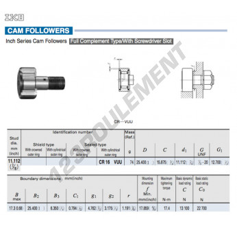 Le Galet De Came Avec Axe, connu sous la référence CR16-VUU-IKO, de la marque IKO, possède un diamètre intérieur de 11.112mm, un diamètre extérieur de 25.4mm et une épaisseur de 15.875mm.