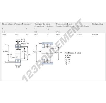 Le Roulement à Rotule Sur Billes, connu sous la référence 13948-SKF, de la marque SKF, possède un diamètre intérieur de 240mm, un diamètre extérieur de 320mm et une épaisseur de 60mm.