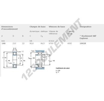Le Roulement à Billes, connu sous la référence 16028-SKF, de la marque SKF, possède un diamètre intérieur de 140mm, un diamètre extérieur de 210mm et une épaisseur de 22mm.