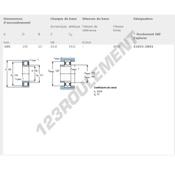 Le Roulement à Billes, connu sous la référence 61821-2RS-SKF, de la marque SKF, possède un diamètre intérieur de 105mm, un diamètre extérieur de 130mm et une épaisseur de 13mm.