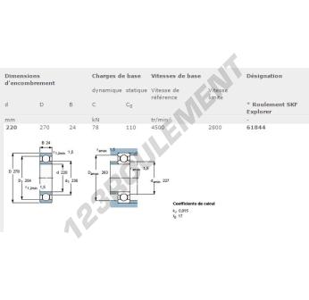 Le Roulement à Billes, connu sous la référence 61844-SKF, de la marque SKF, possède un diamètre intérieur de 220mm, un diamètre extérieur de 270mm et une épaisseur de 24mm.
