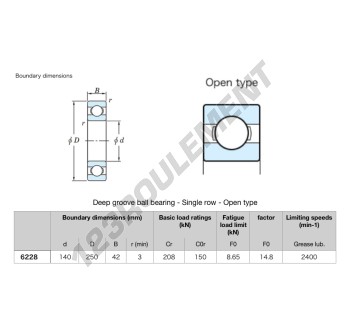 Le Roulement à Billes, connu sous la référence 6228-JTEKT, de la marque JTEKT, possède un diamètre intérieur de 140mm, un diamètre extérieur de 250mm et une épaisseur de 42mm.