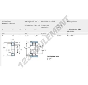 Le Roulement à Billes, connu sous la référence 627-ZZ-SKF, de la marque SKF, possède un diamètre intérieur de 7mm, un diamètre extérieur de 22mm et une épaisseur de 7mm.