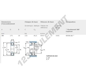 Le Roulement à Billes, connu sous la référence 6316-ZZ-SKF, de la marque SKF, possède un diamètre intérieur de 80mm, un diamètre extérieur de 170mm et une épaisseur de 39mm.
