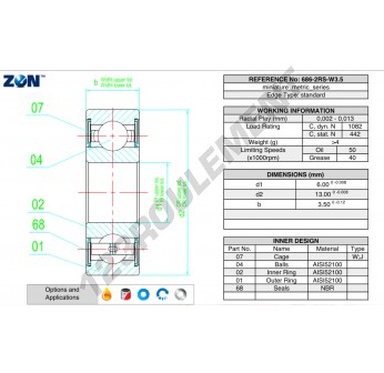 Le Roulement à Billes, connu sous la référence 686-2RS-W3.5-ZEN, de la marque ZEN, possède un diamètre intérieur de 6mm, un diamètre extérieur de 13mm et une épaisseur de 3.5mm.
