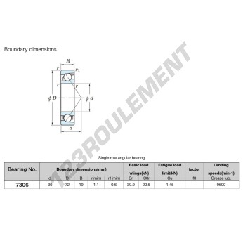 Le Roulement à Billes, connu sous la référence 7306-JTEKT, de la marque JTEKT, possède un diamètre intérieur de 30mm, un diamètre extérieur de 72mm et une épaisseur de 19mm.
