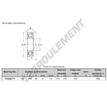 Le Roulement à Billes, connu sous la référence 7332-B-FY-JTEKT, de la marque JTEKT, possède un diamètre intérieur de 160mm, un diamètre extérieur de 340mm et une épaisseur de 68mm.
