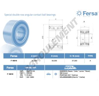 Le Roulement à Billes, connu sous la référence F16019-ASFERSA, de la marque ASFERSA, possède un diamètre intérieur de 34mm, un diamètre extérieur de 64mm et une épaisseur de 37mm.
