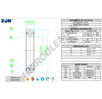 Le Roulement à Billes, connu sous la référence F61701-ZZ-ZEN, de la marque ZEN, possède un diamètre intérieur de 12mm, un diamètre extérieur de 18mm et une épaisseur de 4mm.