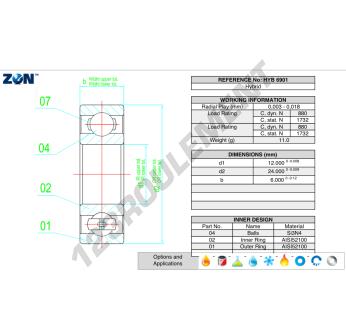 Le Roulement à Billes, connu sous la référence HYB-6901-ZEN, de la marque ZEN, possède un diamètre intérieur de 12mm, un diamètre extérieur de 24mm et une épaisseur de 6mm.