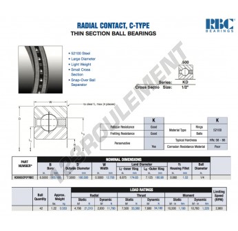Le Roulement à Billes, connu sous la référence KD065-CP0-RBC, de la marque RBC, possède un diamètre intérieur de 165.1mm, un diamètre extérieur de 190.5mm et une épaisseur de 12.7mm.