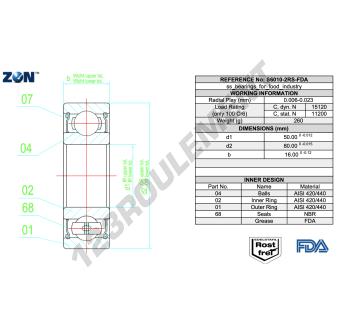Le Roulement à Billes, connu sous la référence S6010-2RS-FDA-AISI420-ZEN, de la marque ZEN, possède un diamètre intérieur de 50mm, un diamètre extérieur de 80mm et une épaisseur de 16mm.
