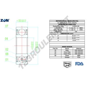 Le Roulement à Billes, connu sous la référence S6205-2RS-FDA-AISI420-ZEN, de la marque ZEN, possède un diamètre intérieur de 25mm, un diamètre extérieur de 52mm et une épaisseur de 15mm.