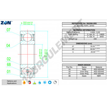 Le Roulement à Billes, connu sous la référence S62206-2RS-ZEN, de la marque ZEN, possède un diamètre intérieur de 30mm, un diamètre extérieur de 62mm et une épaisseur de 20mm.