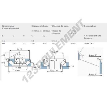 La Butée à Rouleaux, connue sous la référence 29412-E-SKF, de la marque SKF, possède un diamètre intérieur de 60 mm, un diamètre extérieur de 130 mm et une épaisseur de 42 mm.