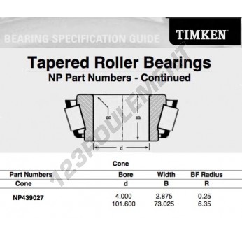 Le Cône, connu sous la référence NP439027-TIMKEN, de la marque TIMKEN, possède un diamètre intérieur de 101.6 mm.