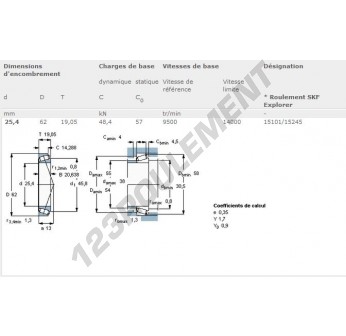 Le Roulement Conique, connu sous la référence 15101-15245-SKF, de la marque SKF, possède un diamètre intérieur de 25.4mm, un diamètre extérieur de 62mm et une épaisseur de 20.638mm.
