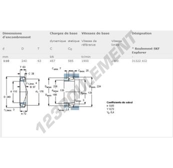 Le Roulement Conique, connu sous la référence 31322XJ2-SKF, de la marque SKF, possède un diamètre intérieur de 110mm, un diamètre extérieur de 240mm et une épaisseur de 63mm.