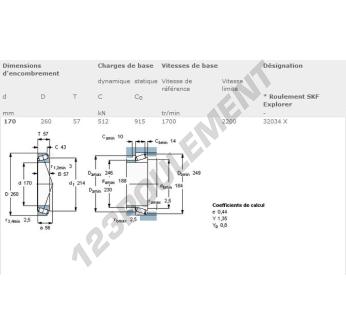 Le Roulement Conique, connu sous la référence 32034X-SKF, de la marque SKF, possède un diamètre intérieur de 170mm, un diamètre extérieur de 260mm et une épaisseur de 57mm.