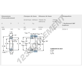 Le Roulement Conique, connu sous la référence 32044X-SKF, de la marque SKF, possède un diamètre intérieur de 220mm, un diamètre extérieur de 340mm et une épaisseur de 76mm.