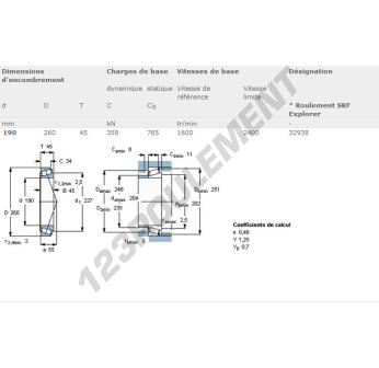 Le Roulement Conique, connu sous la référence 32938-SKF, de la marque SKF, possède un diamètre intérieur de 190mm, un diamètre extérieur de 260mm et une épaisseur de 45mm.