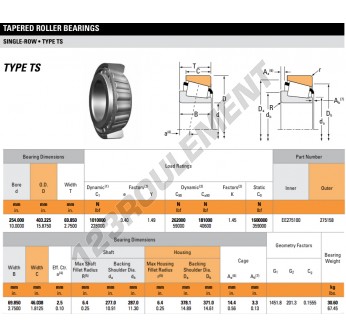Le Roulement Conique, connu sous la référence EE275100-275158-TIMKEN, de la marque TIMKEN, possède un diamètre intérieur de 254mm, un diamètre extérieur de 403.225mm et une épaisseur de 69.85mm.