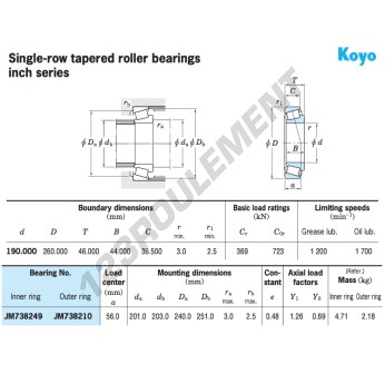 Le Roulement Conique, connu sous la référence JM738249-JM738210-JTEKT, de la marque JTEKT, possède un diamètre intérieur de 190mm, un diamètre extérieur de 260mm et une épaisseur de 46mm.