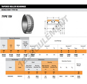 Le Roulement Conique, connu sous la référence M252349D-M252310-TIMKEN, de la marque TIMKEN, possède un diamètre intérieur de 269.875mm, un diamètre extérieur de 381mm et une épaisseur de 136.525mm.